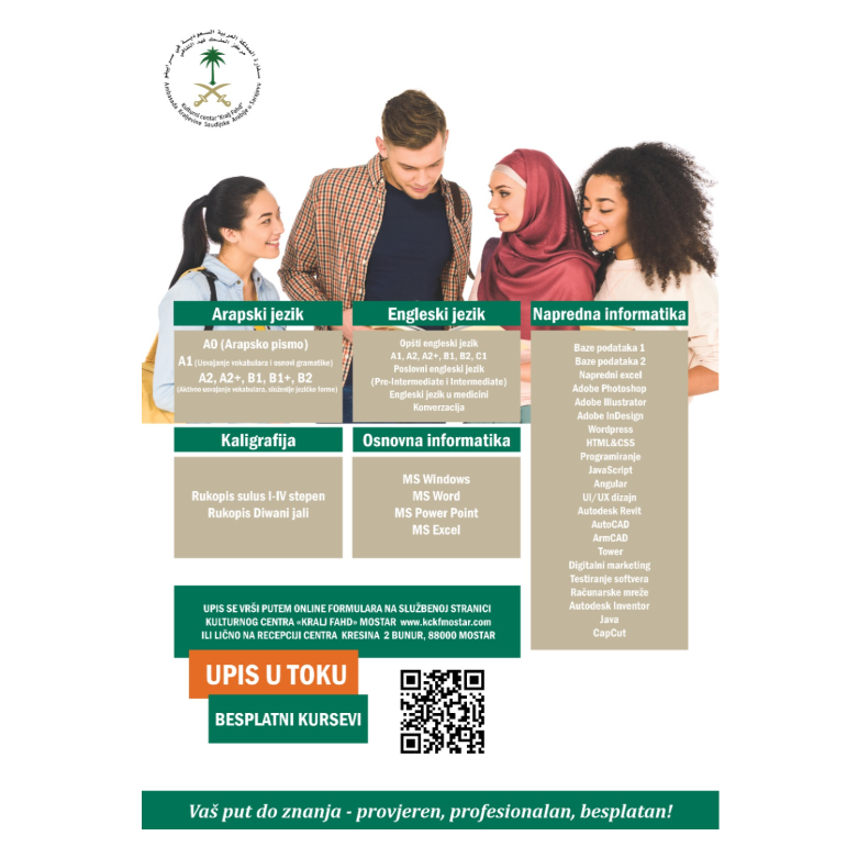 Upis na besplatne certificirane kurseve iz arapskog jezika, engleskog jezika, kaligrafije i informatike za odrasle je u toku !