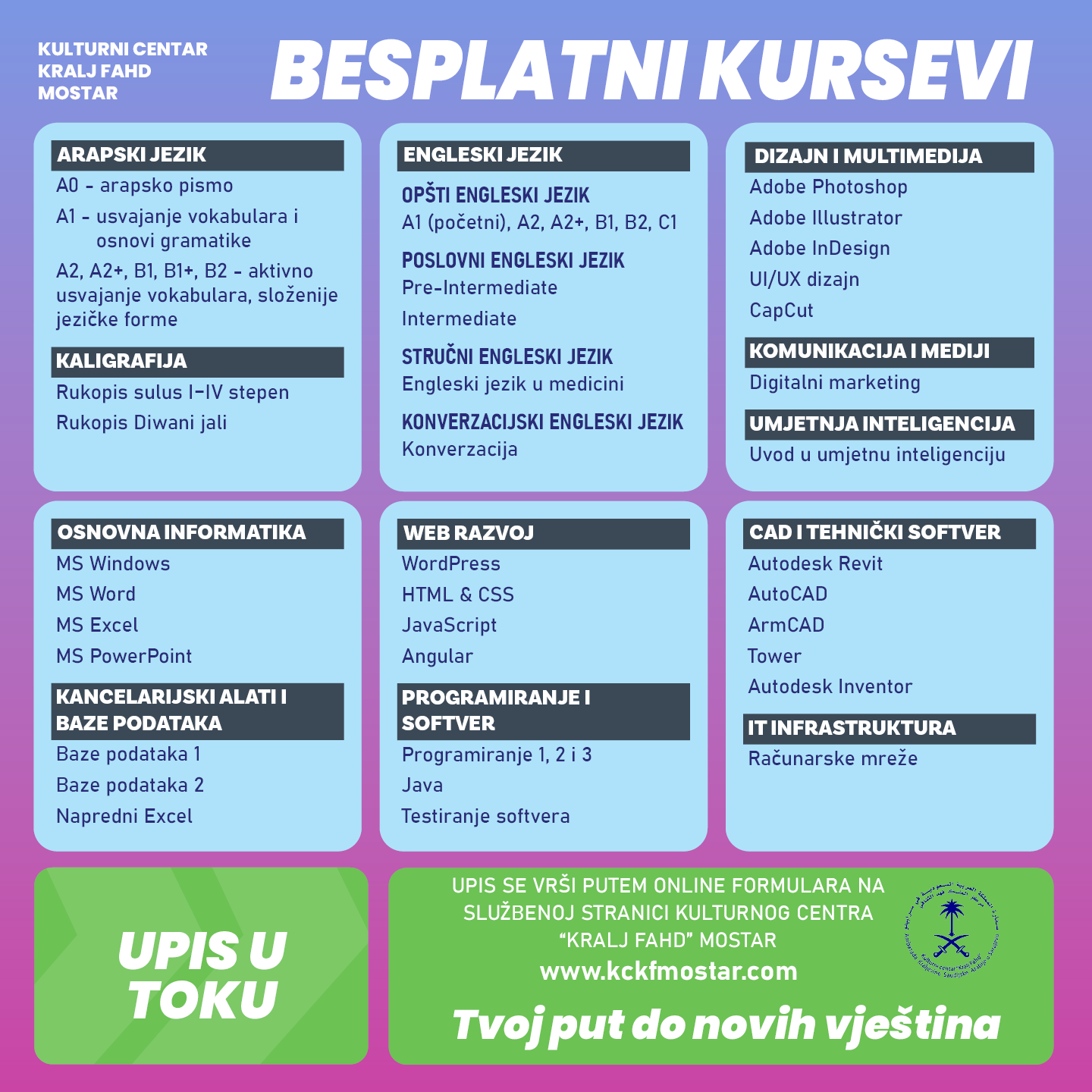 Upis na besplatne certificirane kurseve iz arapskog i engleskog jezika, kaligrafije i informatike za odrasle je u toku !